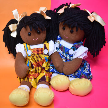 Meet our Kaya Rag Doll, a lovely soft cuddly doll by Just Like Me Toys. Her body is made with brown polyester fabric and polyester fillings. She has black eyes made from plastic and  a tiny stitched-on month.  Her hair is woollen, Rasta style, long  and black, and is secured with two yellow ribbons into ponytails, that matches her stitched-on yellow shoes.
