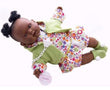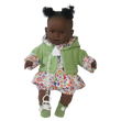 She is a soft-bodied doll, ideal for cuddling. Her green floral dress matches her jacket, booties, and hairbands, creating a harmonious look. The doll's design encourages imaginative play, making it a cherished companion for young children.